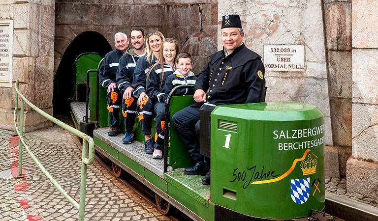Am nordöstlichen Ende von Berchtesgaden findet ihr das Salzbergwerk, in dem seit über 500 Jahren das „weiße Gold“ abgebaut wird. Ein Besuch in dem unterirdischen Bergwerk ist ein absolutes Highlight für Familien, und das fängt bereits am Eingang aufregend an: Ihr zieht euch stilechte Bergwerk-Overalls über. Warum ihr die braucht, merkt ihr spätestens nach der rund 1,4 Kilometer langen Fahrt mit der Grubenbahn bis ins Innere des Bergs.