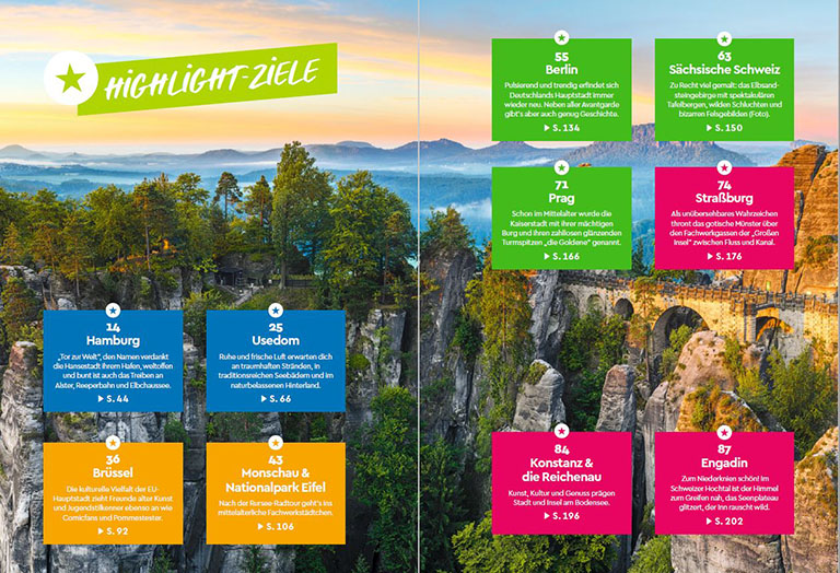 In jedem der nach Regionen gegliederten Kapitel gibt es zwischen 20 und 29 Vorschläge für Kurztrips. Jedes Reiseziel wird auf einer Doppelseite mit fünf bis sechs Erlebnis-Highlights und Sehenswürdigkeiten vorgestellt – vom alten Leuchtturm auf Wangerooge und dem Ozeaneum in Stralsund in Norddeutschland über die Altstadt von Münster und das Dresdner Gründerzeitquartier in der Mitte der Bundesrepublik bis hin zu Süddeutschland mit seiner hügeligen Feldbergregion und dem tiefblauen Ammersee. Dazu präsentiert das Buch zu jedem Ziel einen Regenwetter-Tipp, damit der Trip auch bei Schietwetter nicht ins Wasser fällt. Kurzum: Mit diesen Ausflugstipps ist ein prallgefülltes, abwechslungsreiches Wochenende garantiert.