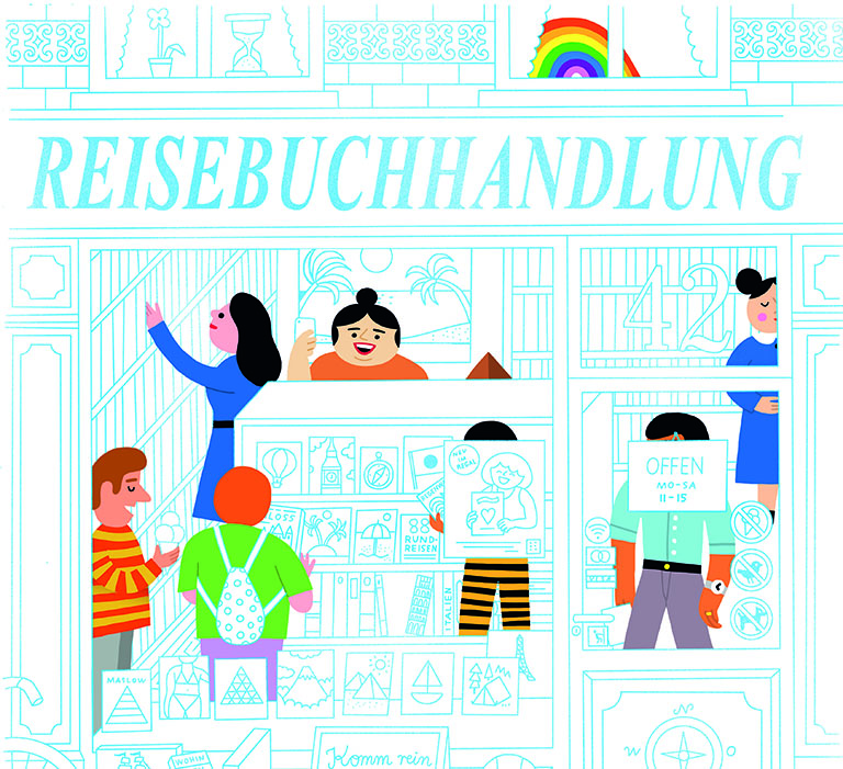 Zahlen führen durch Alle Reisen: Am Anfang des Buchs sitzt ein Mensch in der blassblau gezeichneten Kulisse und dreht seinen Globus. Fernweh macht sich breit: Wohin würde man gerne reisen? Ein paar Seiten weiter tauchen 10 Menschen in einem fernen Meer in die Tiefe, dann wieder bestaunen 15 großen und kleine Menschen den Regenwald. So geht das weiter und weiter und weiter …