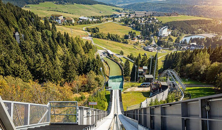Oberwiesenthal liegt exakt 914 Meter über dem Meeresspiegel – und gilt damit als die höchstgelegene Stadt Deutschlands. Höchster Punkt ist der Fichtelberg, den ihr von hier aus ganz bequem mit der Schwebebahn erreichen könnt. Von oben habt ihr einen atemberaubenden Ausblick auf das umliegende Erzgebirge und die Skisprungschanzen.