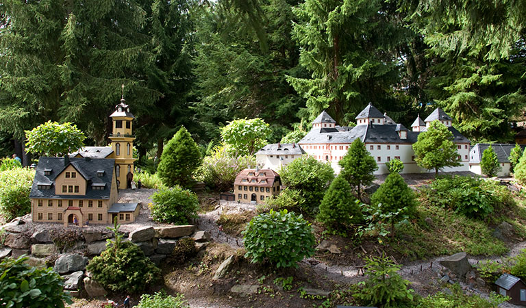 Rund 200 detailgetreue Nachbildungen von Kirchen und profanen Gebäuden im Maßstab 1:25, handgefertigte Figuren und Tiere in Mini-Format, liebevoll gestaltete Landschaftsbilder und Szenerien sowie diverse Erlebnisbereiche für die Kids: Das ist das Klein-Erzgebirge, der älteste Miniaturpark der Welt, zu finden im Stadtpark von Oederan.