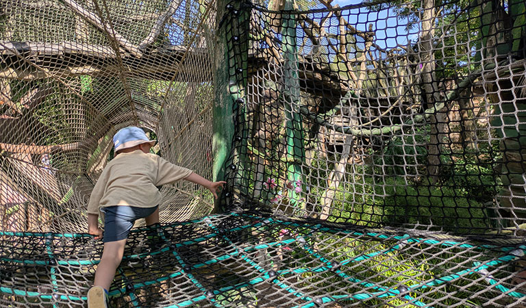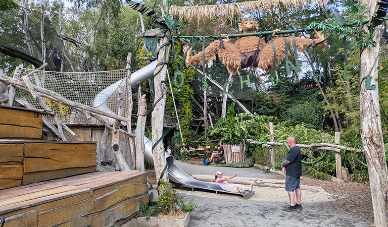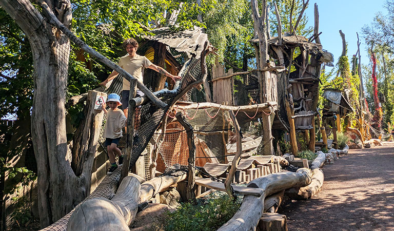 Wir streifen durch den Park, balancieren über Baumstämme und wackelige Brücken, entdecken magische Hütten und Tunnelrutschen. Wir lassen Murmeln kullern, entspannen in Hängematten, bestaunen hölzerne Kunstwerke und ein Matschareal, in dem meine Söhne am liebsten Stunden bleiben würden.