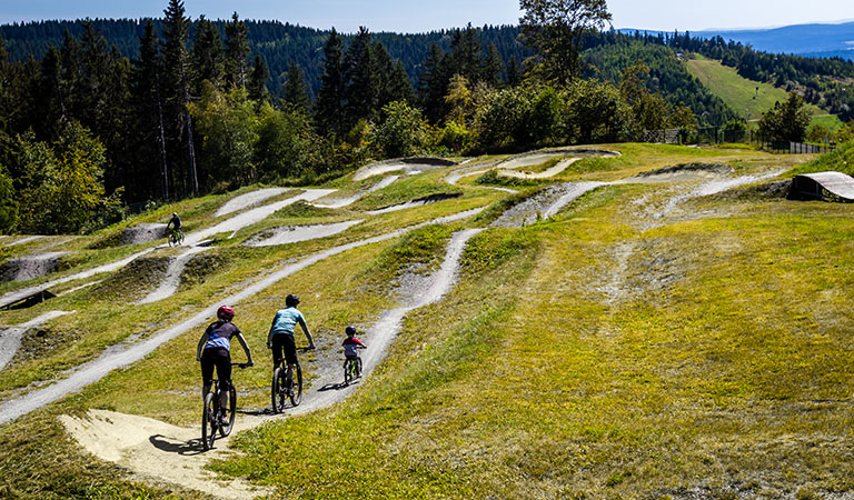 Auf diesem rund eineinhalb Kilometer langen, kinderwagentauglichen Weg könnt ihr an 11 interaktiven Stationen eure Murmeln (gibt es im Automaten an der Tourist-Information) rollen lassen und spannenden Räuber-Geschichten lauschen. Am Ende der Tour wartet dann einer der größten Spielplätze der Region, auf dem eure Kinder klettern, rutschen und toben können, während ihr es euch beim Hüttenwirt gemütlich macht.