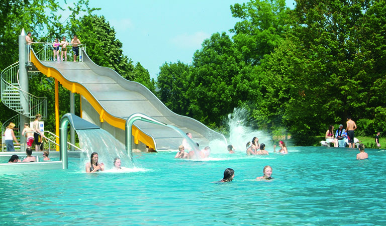 Im Sommer locken das Freibad Rosenau und das Schwimmbad Waidesgrund mit Schwimm- und Kinderbecken, Rutschen und Sprungtürmen. Wer es etwas sportlicher mag, ist im Sportbad Ziehers an der richtigen Adresse. Während die Großen hier ihre Bahnen schwimmen, planschen die Kleinen im Babybecken mit knallgelbem U-Boot. Ein weiteres Hallenbad: das Stadtbad Esperanto – mit Spaßbereich und Spabereich.