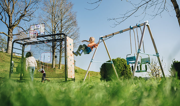 Jetzt mal zehn Minuten nur für mich. Der Holzsteg und ich. Unter mir das Wasser des Naturbadeteichs, das natürlich noch ganz schön kalt ist zum Baden. Dafür aber wärmt von oben die Sonne, die kraftvoll vom wolkenlosen Himmel grüßt. Mit geschlossenen Augen nimmt man alles noch intensiver wahr: das Zwitschern der Vögel aus dem nahegelegenen Wald, die heiteren Stimmen meiner Kinder, die sich gerade auf dem Spielplatz vergnügen, die Luft, die sich hier oben auf 1.000 Meter Höhe um das Tausendfache frischer und gesünder anfühlt. So könnte ich noch etliche zehn Minuten liegen bleiben. Doch bald schon ruft die Tochter: „Papa, wie wär‘s mit ’ner Spritztour aufm Kettcar übern Hof?“ – Da sag ich nicht nein.