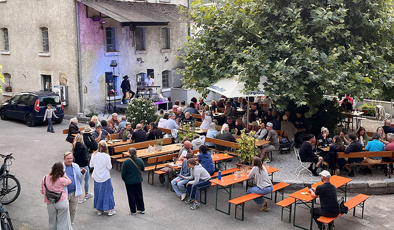 Der nächste Morgen beginnt mit einem Ritual, das uns die ganze Woche begleitet: Spaziergang über die Altmühlbrücke, hin zum Restaurant Mühlenwirt, das wie der Kanuverleih zur Aktivmühle gehört und seit 2024 von ReNatour betrieben wird. Hier zeigt sich gleich die Philosophie des Familiencamps: familiäre Atmosphäre, kurze Wege, und eine leckere Halbpension mit regionalen Produkten. Zum Frühstück gibt es frisches Brot und Semmeln, regionale Käse- und Wurstspezialitäten, Obst, Joghurt, Müsli und für die Kinder heiße Schokolade. Während wir Eltern uns über den duftenden Kaffee freuen, haben die Kinder schon ihre Lieblingsplätzchen am Buffet entdeckt.