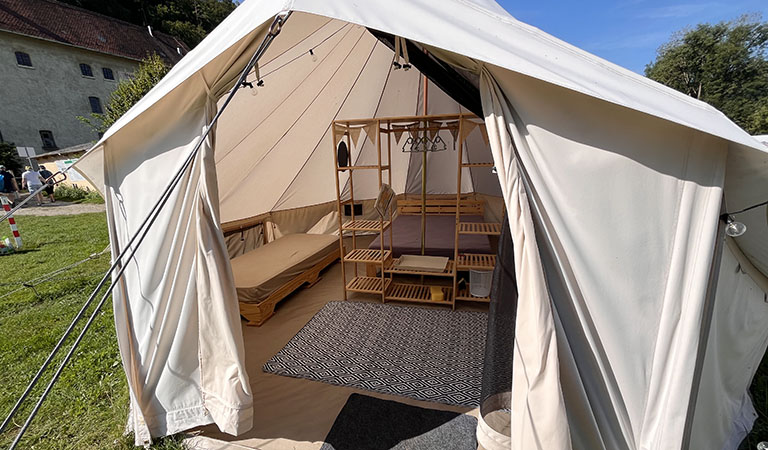 „Herzlich willkommen im Insel-Camp“, begrüßt uns Campleiterin Katrin, die uns und eine Handvoll weiterer Familien durch die kommende Woche begleiten wird. Nach einer kurzen Einführung und einem ersten Rundgang zeigt sie uns unser Urlaubsdomizil. Die Kinder stürmen ins Glampingzelt – und staunen: richtige Betten, eine Lichterkette, Regal, Spiegel und dazu jede Menge Platz.
