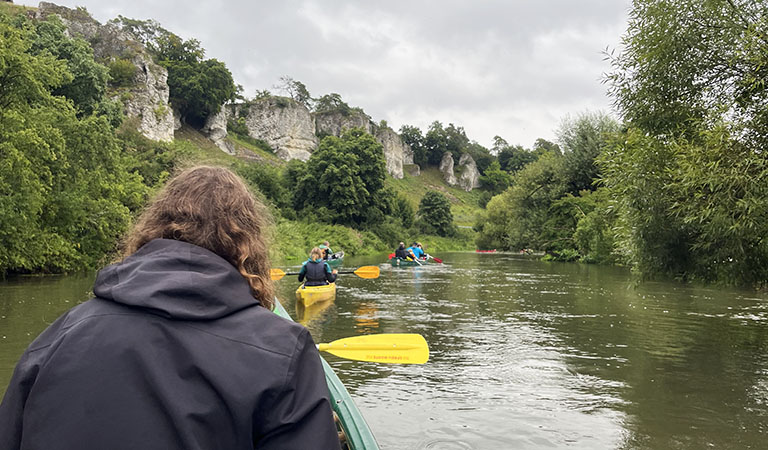 Zu den Höhepunkten der Woche zählen ohne Zweifel die Kanutouren auf der Altmühl. Oliver und Katrin, unsere professionelle Begleitung für die Kanutouren, erklären uns die Grundregeln fürs Paddeln, bevor es losgeht: eine Tagestour stromabwärts bis nach Dollnstein. Mit unseren Kanus schippern wir über den Fluss, der sich sanft durch das Tal schlängelt, vorbei an grünen Wiesen und bizarren Felsformationen. Hinter Solnhofen ragen die berühmten Zwölf Apostel eindrucksvoll empor – Kalksteinfelsen, die wie Wächter über dem Fluss thronen.