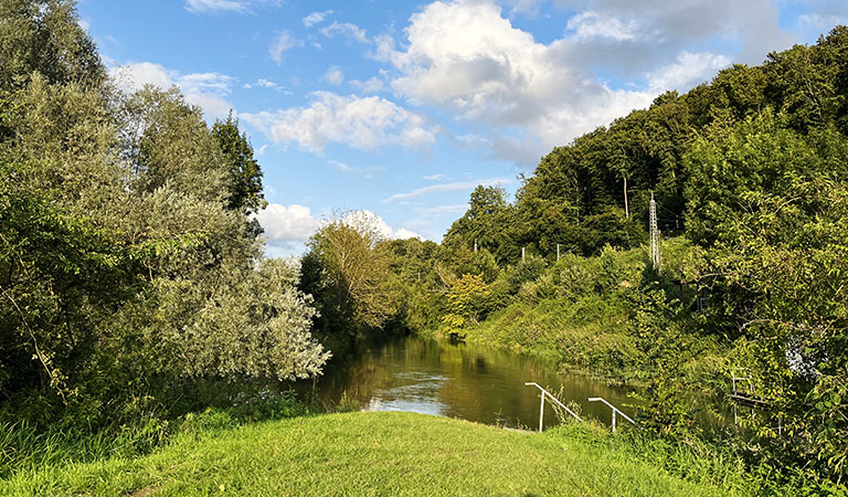 Denn noch etwas steht auf dem Wochenprogramm: Zeit für Freizeit. Genau jetzt. Theodor erobert sofort den Spielplatz auf der Insel und schwingt sich auf der Schaukel in die Lüfte, Aurelia entdeckt die kleine Treppe zur Altmühl, die direkt zur Badestelle führt. „Können wir gleich schwimmen gehen?“, fragt sie erwartungsvoll. Keine halbe Stunde später stehen wir alle im herrlich erfrischenden Wasser. Wir haben die Altmühl und dieses Naturidyll fast für uns allein, nur ein paar Enten schauen etwas irritiert auf unser fröhliches Geplansche.