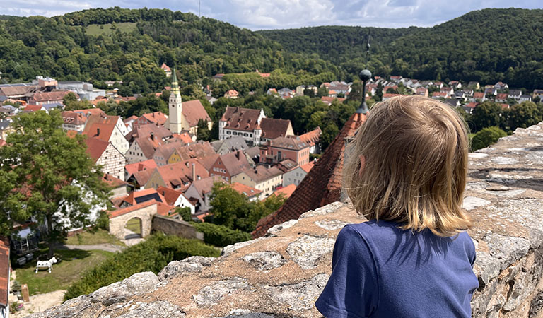 Nach einem imposanten Ausblick vom Burgturm lockt das malerische Städtchen am Fuße des Burgbergs: Eis für die Kinder, Kaffee und Kuchen für uns Eltern. Den Rückweg treten wir zu Fuß entlang der Altmühl an, wandern durch das idyllische Tal mit Blick auf Wacholderhänge und Schafweiden.