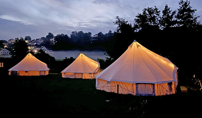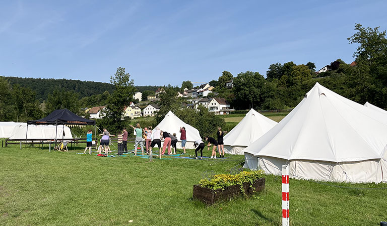 Übernachten Das Camp befindet sich auf einer idyllischen Insel mitten in der Altmühl. Ihr übernachtet im eigenen Zelt, in Mietzelten, in gemütlichen Glampingzelten oder ihr stellt euren Camper auf einem der Wohnmobil-Stellplätze in der Nähe des Insel-Camps ab.