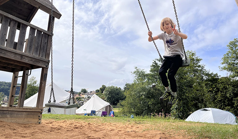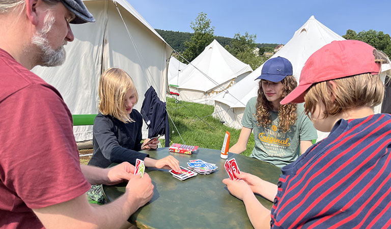 So gestärkt geht es gleich viel leichter los ins Programm. Und das ist bunt: Während die Kinder beim Kinderprogramm den Stockbrotteig vorbereiten, eine Rallye über den Campingplatz machen oder kleine Spiele im Gemeinschaftspavillon spielen, bleibt für uns Eltern Zeit für uns: für Gespräche oder ein gutes Buch, für einen Spaziergang in die malerische Umgebung oder einfach mal ein stilles Päuschen auf der Wiese. Abends sitzen wir dann alle am ersehnten Lagerfeuer. Mit glühenden Wangen drehen die Kinder ihre Stöcke über die Glut, während die Dämmerung hereinbricht. Ein Moment, der so einfach und gleichzeitig so vollkommen ist.