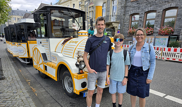 An der Touristinformation steigen wir in die Stadt- und Panoramabahn und bekommen auf der rund 45-minütigen Fahrt weitere Einblicke – dank der Lautsprecherdurchsagen auch in die spannende Geschichte der Stadt, in ihrer heutigen Form erst 1905 durch den Zusammenschluss der Stadt Bernkastel mit dem angrenzenden Winzerdorf Kues entstanden.