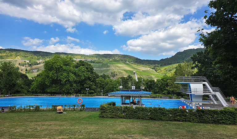 „Wow, schaut euch mal den Ausblick an“, schwärme ich, kurz nachdem wir unser großzügiges Familienzimmer mit eigener Dachterrasse bezogen haben, bestaune die grünen Weinberge ringsum und den Blick auf die mittelalterliche Burgruine Landshut, Wahrzeichen von Bernkastel-Kues. Tjark hingegen hat etwas anderes erspäht: das „Moselbad“, eine Schwimmhalle mit Freibad und Sprungturm direkt neben dem Hotel. Und das Beste: JUFA-Gäste haben freien Eintritt – die perfekte Abkühlung nach der langen Anreise!