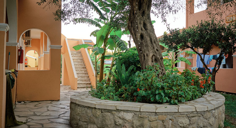 Erstmal zur Lage, denn die ist wirklich ein Traum: Das Familienhotel befindet sich im Honigtal auf Korfu, in Agios Georgios im Nordwesten der grünen Insel. Bis zum Strand in einer der schönsten Badebuchten Korfus ist es nur ein kleiner Fußmarsch. Aber auch die Anlage selbst ist mit ihrem riesigen Garten ein richtiges Naturidyll. Hier baumeln bunte Hängematten zwischen knorrigen Olivenbäumen, Bienen schwirren über dem Gemüsegarten, Hühner scharren in der Erde und neugierige Ziegen klettern auf dicken Baumstämmen. Und mittendrin: überall Spielbereiche und Rückzugsmöglichkeiten für die kleinen und großen Gäste. Ganz zu schweigen von den gemütlichen Unterkünften: Auf der Anlage verteilen sich fünfzehn 1-Zimmer-Studios (für zwei Personen plus Zustellbett), von denen sich einige über Balkone verbinden lassen, vier 3-Zimmer-Wohnungen für bis zu fünf Personen sowie fünf 3-Zimmer-Wohnungen für bis zu drei Personen auf dem Nachbargrundstück.