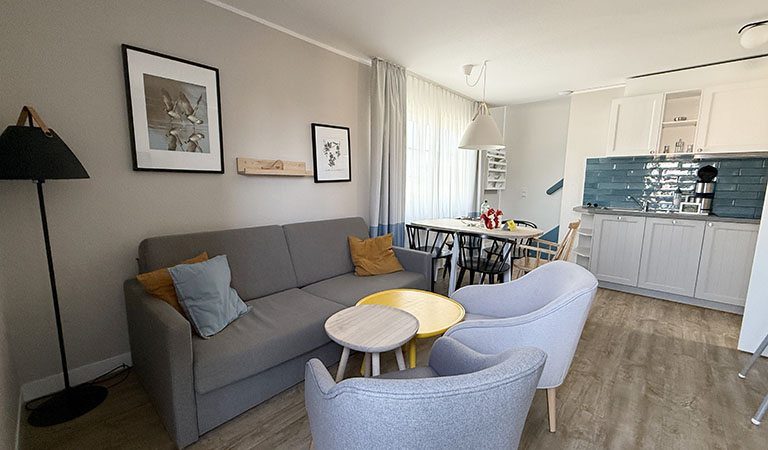 Meine Kinder sind mit 9 und 13 Jahren zwar aus dem Kleinkindalter raus, über den vielen Stauraum freuen wir uns aber auch. Ebenso über die hellen, freundlichen Farben rundherum, den kleinen Balkon, über die zwei Bäder, zwei Schlafzimmer und den großen Wohnbereich mit Esstisch und Sofa. Ich denke still: Beste Voraussetzungen für eine kleine Auszeit! Und beziehe gerade noch nicht mal die resorteigenen Aktivitäten für Klein und Groß mit ein. Nicht das Erlebnisbad Aquafun, die großen Spielplätze, den Fußballplatz, den Jugendclub, den Minigolf-Parcours und, und, und …