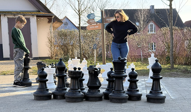 Wir vertrödeln den ersten Tag im BEECH Resort Fleesensee, obwohl: Vertrödeln ist eigentlich nicht der richtige Ausdruck. Wir nehmen das ganze Resort unter die Lupe. Das bereits erwähnte XXL-Schachbrett, die Spielplätze, den Fußballplatz und die Minigolfanlage.