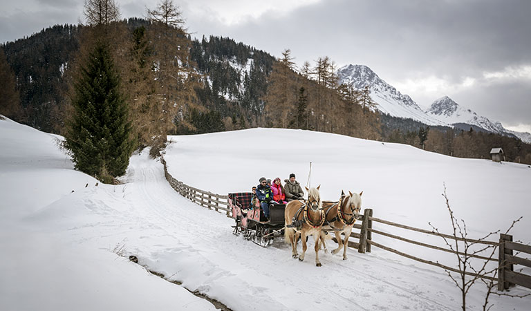Ein bisschen fühlt ihr euch wie die Königsfamilie aus einem Märchenfilm, wenn ihr dick eingewickelt in kuscheligen Decken in der Kutsche sitzt und euch im wahrsten Sinne des Wortes durch die verschneite Landschaft rund um Nauders kutschieren lasst. Der Schnee knirscht unter den Hufen, die zwei kräftigen Haflinger schnaufen, die Glöckchen an der Kutsche bimmeln – ansonsten herrscht himmlische Stille, wenn der Pferdeschlitten nahezu lautlos durch dieses Winteridyll aus Wäldern und sanften Hügeln gleitet. Es könnte sogar sein, dass es selbst euren Kindern bei so viel Winterromantik und Märchenzauber die Sprache verschlägt.