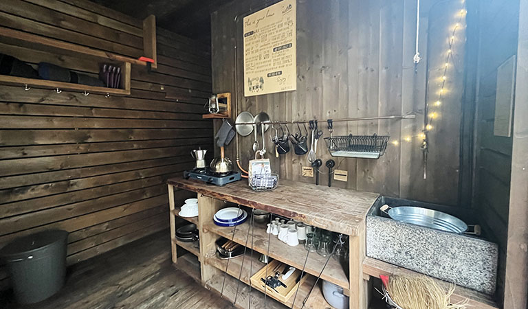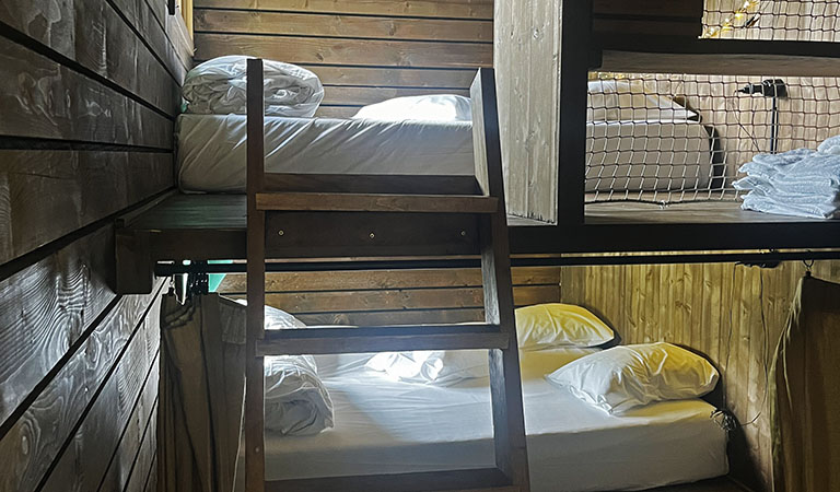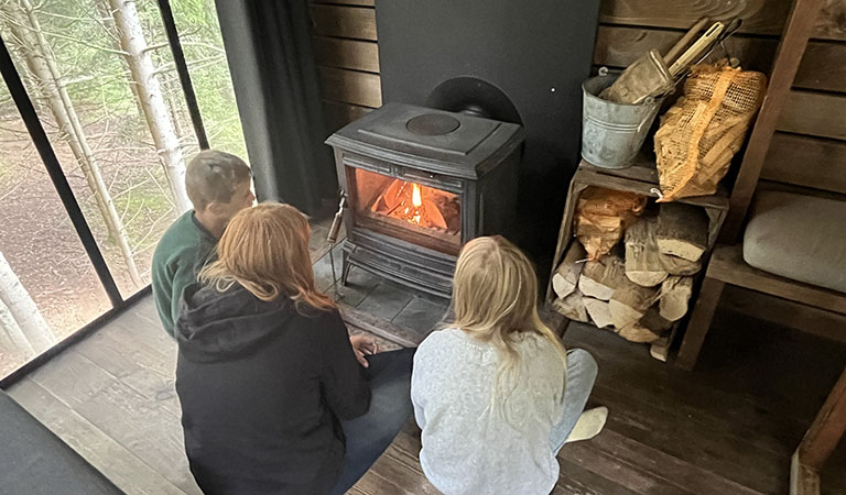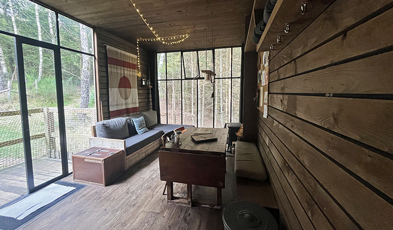 Zurück zu unserer Canopy Cabin, die ganz liebevoll eingerichtet ist: eine kleine Küchenzeile, eine gemütliche Sofaecke, kuschelige Betten und große Panoramafenster, die den Blick auf den dichten Wald freigeben. Den größten Jubel erntet aber die Dachterrasse mit Hängematte, die in unserer Zeit in den Cozy Cabins der meistfrequentierte Platz sein wird. Die Tatsache, dass es keine Heizung gibt, stört uns wenig – die Sonne strahlt in den kommenden Tagen zuverlässig vom Himmel. Und wird es am Abend kühler, verbreitet der knisternde Holzofen schnell eine gemütliche Wärme.