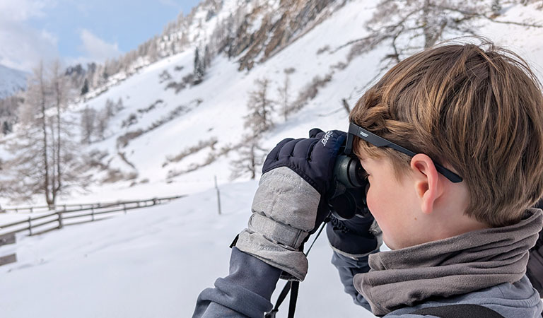 Keine Lifte, keine Skipisten, keine Menschen – ein Anblick, der selten ist im Winterurlaubsland Österreich. Sogar unseren Kindern Jette (15) und Tom (13) hat es die Sprache verschlagen. Sie schauen konzentriert durch ihre Ferngläser, auf der Suche nach den Big Five der Berge.