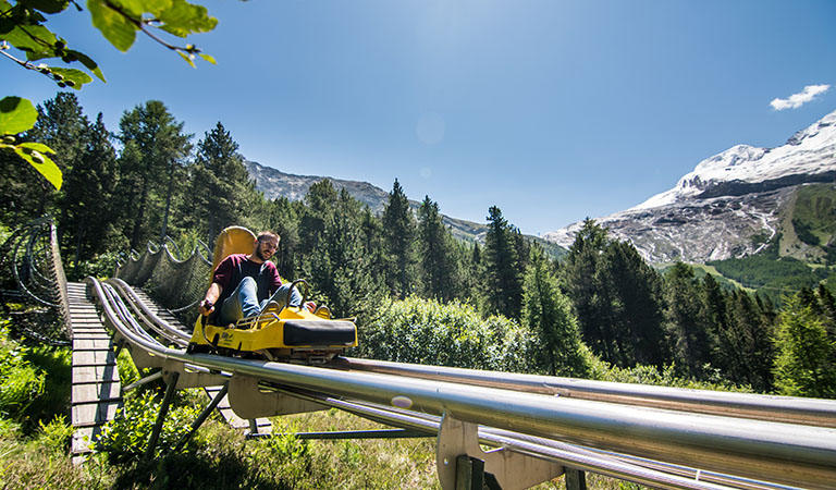 Noch ein Highlight für Familien: die Rodelbobbahn Feeblitz in Saas-Fee. Hoch geht`s mit dem steilsten Rodellift der Alpen zum Start der Bahn. Dann saust ihr mit bis zu 40 Stundenkilometern bergab. Ein Riesenspaß für die ganze Familie – und zu jeder Jahreszeit.