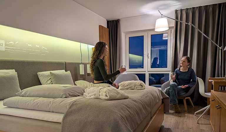 „Echt cool, so ein leeres Schwimmbad“, sind sich Jette und Hannah einig, als wir viele Rutschpartien später im Schwimmbadrestaurant „rêst“ sitzen, uns frischen Salat, Burger und Panini schmecken lassen. Und während Sandra und ich anschließend die große Saunalandschaft ansteuern, gehen die Mädels eingekuschelt in flauschigen Bademänteln zurück ins angrenzende Hotel.