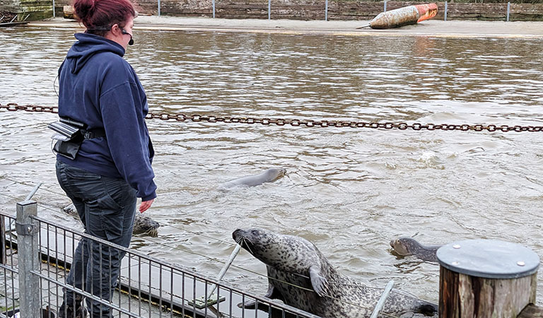 „Ich glaube, es befinden sich exakt 21 Leute im Westküstenpark“, zählt Hannah die Gruppe an Schaulustigen durch, die sich wie wir rund um das Seehundbecken verteilt haben. Die Robbenfütterung ist eines der Highlights des Tierparks mit der größten Seehundanlage Deutschlands. Hannah könnte also richtig damit liegen, dass sich um Punkt 11 Uhr alle Besucherinnen und Besucher hier versammeln – und das sind an diesem Tag nicht viele.