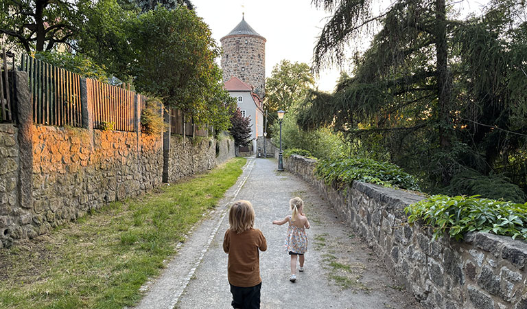 „Was sollen wir zum Abschluss machen?“, frage ich am letzten Urlaubsmorgen. Wir sitzen im Speisesaal der Jugendherberge, auf unserem Frühstückstisch türmen sich Brötchen, Obst, Müsli und andere Leckereien. Die Kinder sind schnell entschieden: Sie möchten nochmal zum Hexenhäusel, eines der ältesten Wohnhäuser von Bautzen, das auf magische Weise allen Stadtbränden und Kriegen standgehalten hat. Direkt daneben befindet sich der Spielplatz vor der Fischerpforte und nur ein paar Treppenstufen tiefer die Spree – perfekt, um sich die Füße abzukühlen. Klingt nach einem perfekten Plan! „Und wann kommen wir wieder? Wir haben Rapunzel doch noch gar nicht gefunden“, fragt Rosie. Ich lächle. „Bald“, verspreche ich, „ganz bald.“