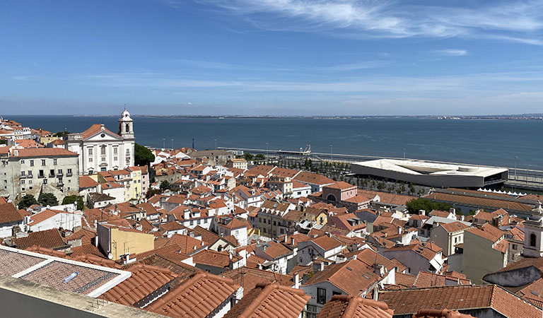 „Ein Pfau“, rufen die Kinder begeistert und sprinten los, als wir hoch oben beim Castelo de São Jorge ankommen. Die Festungsanlage thront mit ihren Türmen, den Wachposten und dem Burggraben weit oben über Lissabon. Ich lasse meine Blicke erst über die alten Gemäuer schweifen und dann über Lissabon, über die vielen roten Dächer, über den Tejo und den weiten Atlantik. Was für ein Ausblick!, denke ich still und kann mich nur mühsam losreißen. Aber die Mädchen möchten im Schatten der Pinien picknicken, wie viele andere Familien auch.