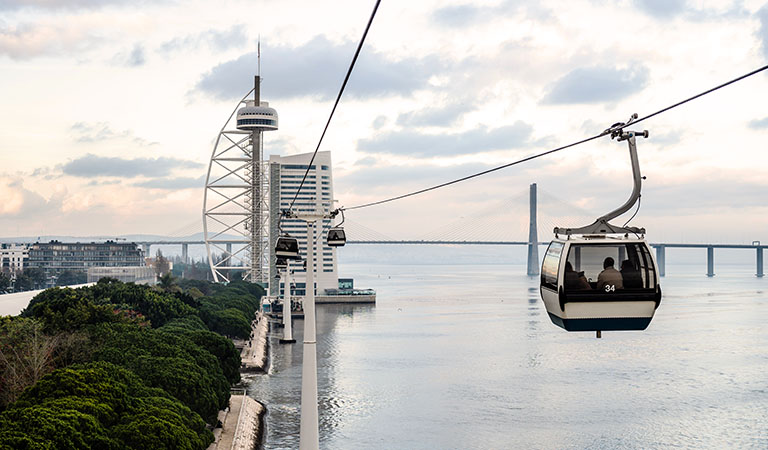 Zurück in Lissabon bleibt uns nicht mehr viel Zeit: „Wir müssen unbedingt noch mit der Seilbahn fahren“, findet Mia. Gesagt, getan: Die Rundfahrt dauert pro Weg zwischen acht und zwölf Minuten und bietet einen fantastischen Weitblick auf die mit über 17 Kilometern längste Brücke Europas, die Ponte Vasco da Gama.