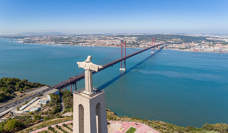 Mia wirft ein zweites 50-Cent-Stück ein und späht gebannt durchs Fernrohr: Schon entdeckt sie eine Sehenswürdigkeit: den Christo Rei, eine riesige Christusstatue auf der Südseite des Tejo, dem großen Fluss, der bei Lissabon in den Atlantik mündet. „Irgendwo habe ich diese Jesus-Statue doch schon mal in einem Buch gesehen“, sinniert sie leise. Ich kläre sie auf: „In Rio de Janeiro in Brasilien steht auch so eine.“ Mia staunt und findet noch ein weiteres Wahrzeichen der südeuropäischen Seefahrer-Metropole: die große, rote Hängebrücke Ponte 25 de Abril, die über den Fluss Tejo führt.