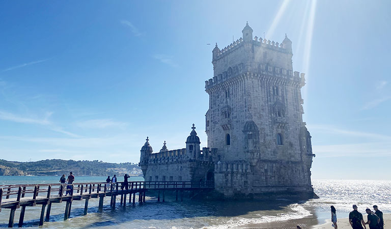 Erster Stopp in Belém: Das aus dem 16. Jahrhundert stammende Prachtkloster Mosteiro dos Jerónimos, das zum Weltkulturerbe zählt. Wir werfen bewundernde Blicke auf die Fassaden, dann wandern wir weiter, zum „Denkmal der Entdeckungen“ (Padrão dos Descobrimentos), das den portugiesischen Entdeckern aus dem 15. und 16. Jahrhundert gewidmet ist. Und am späten Nachmittag ist es endlich soweit: Wir stehen vor dem berühmten Torre de Belém, der 1515 vom portugiesischen König Manuel I. in Auftrag gegeben wurde und ursprünglich als Leuchtturm diente. „Das ist ja romantisch hier“, findet Mia, als die Sonne langsam hinter dem Turm verschwindet und die Meereswellen zu beiden Seiten um das Bauwerk schlagen.